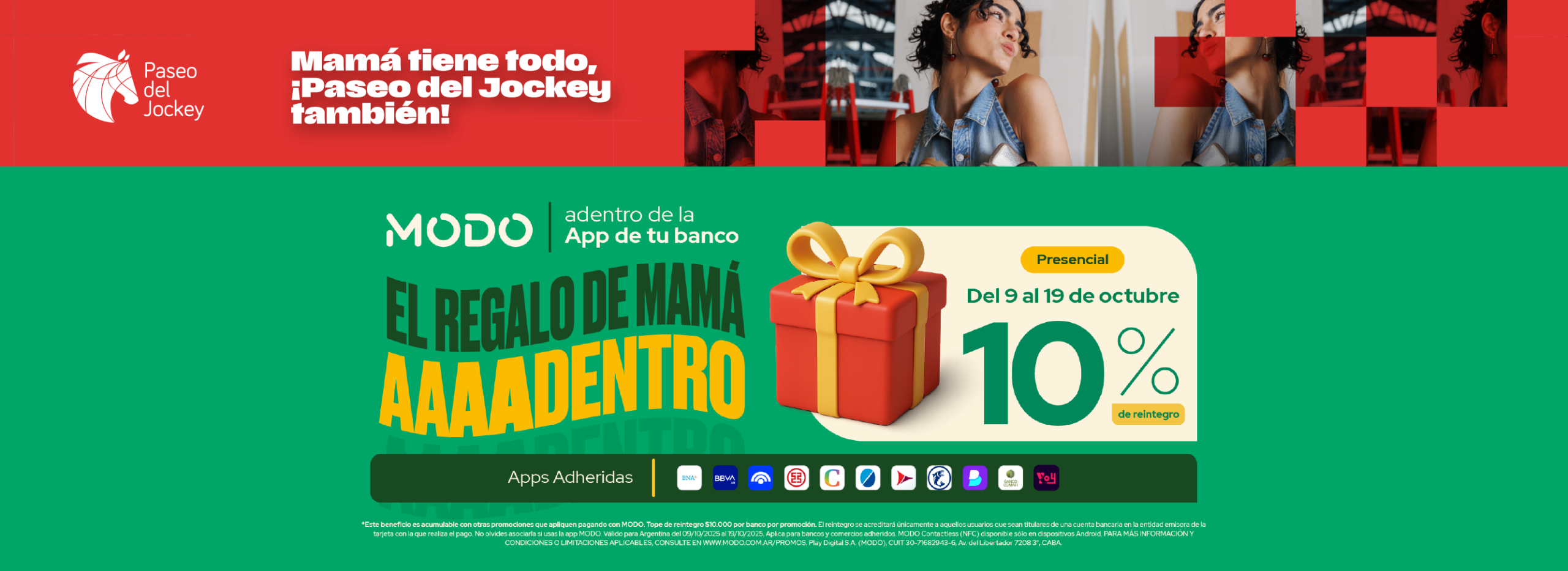 *ESTE BENEFICIO ES ACUMULABLE CON OTRAS PROMOCIONES QUE APLIQUEN PAGANDO CON MODO. TOPE DE REINTEGRO $10.000 POR BANCO POR PROMOCIÓN. EL REINTEGRO SE ACREDITARÁ ÚNICAMENTE A AQUELLOS USUARIOS QUE SEAN TITULARES DE UNA CUENTA BANCARIA EN LA ENTIDAD EMISORA DE LA TARJETA CON LA QUE REALIZA EL PAGO. NO OLVIDES ASOCIARLA SI USAS LA APP MODO. VÁLIDO PARA ARGENTINA DEL 09/10/2025 AL 19/10/2025. APLICA PARA BANCOS Y COMERCIOS ADHERIDOS. MODO CONTACTLESS (NFC) DISPONIBLE SÓLO EN DISPOSITIVOS ANDROID. PARA MÁS INFORMACIÓN Y CONDICIONES O LIMITACIONES APLICABLES, CONSULTE EN WWW.MODO.COM.AR/PROMOS. PLAY DIGITAL S.A. (MODO), CUIT 30-71682943-6, AV. DEL LIBERTADOR 7208 3°, CABA.
