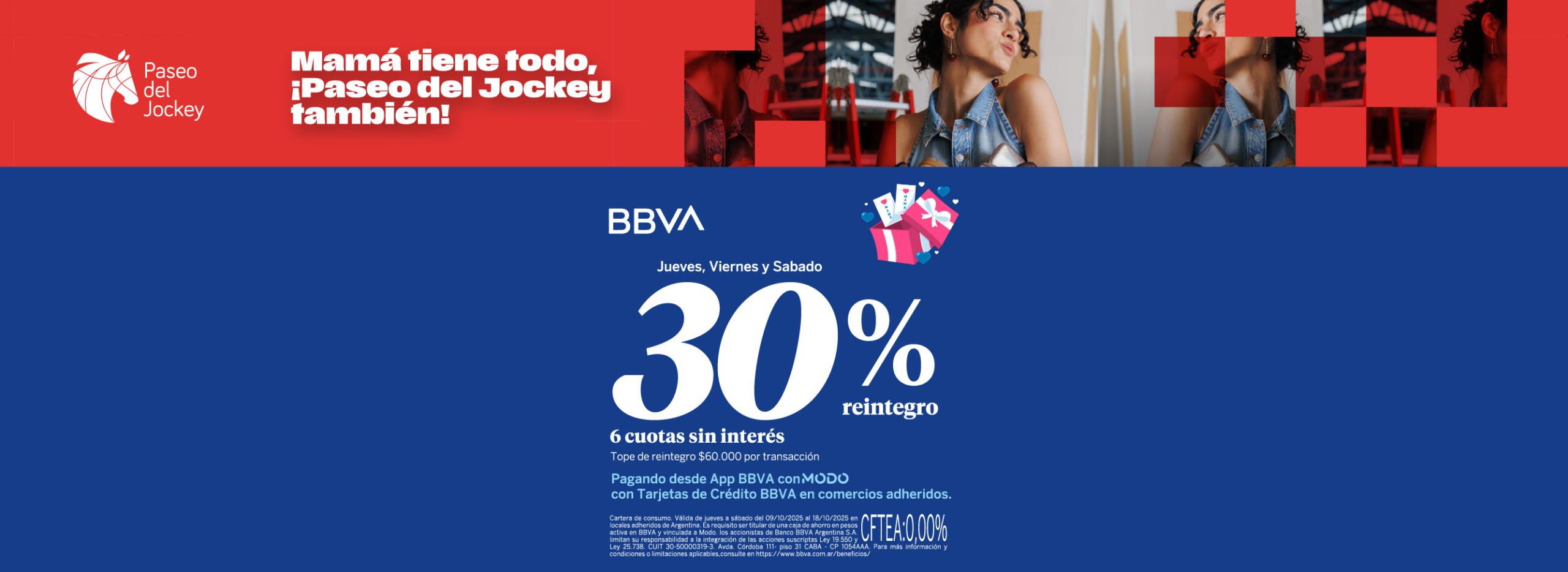 CARTERA DE CONSUMO. VÁLIDA DE JUEVES A SÁBADO DEL 09/10/2025 AL 18/10/2025 EN LOCALES ADHERIDOS DE ARGENTINA. ES REQUISITO SER TITULAR DE UNA CAJA DE AHORRO EN PESOS ACTIVA EN BBVA Y VINCULADA A MODO. LOS ACCIONISTAS DE BANCO BBVA ARGENTINA S.A. LIMITAN SU RESPONSABILIDAD A LA INTEGRACIÓN DE LAS ACCIONES SUSCRIPTAS LEY 19.550 Y LEY 25.738. CUIT 30-50000319-3. AVDA. CÓRDOBA 111- PISO 31 CABA – CP 1054AAA. PARA MÁS INFORMACIÓN Y CONDICIONES O LIMITACIONES APLICABLES,CONSULTE EN HTTPS://WWW.BBVA.COM.AR/BENECIOS/