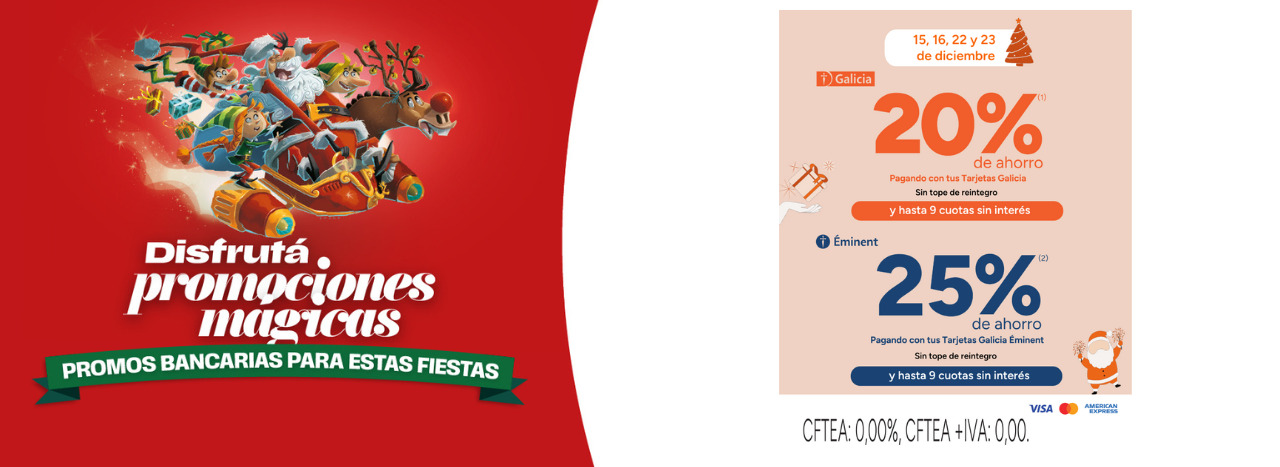 (1) Cartera General: 20% de ahorro y hasta 9 cuotas sin interés abonando con Tarjetas Galicia Débito, Tarjeta Visa, Tarjeta Mastercard, Tarjeta American Express.
